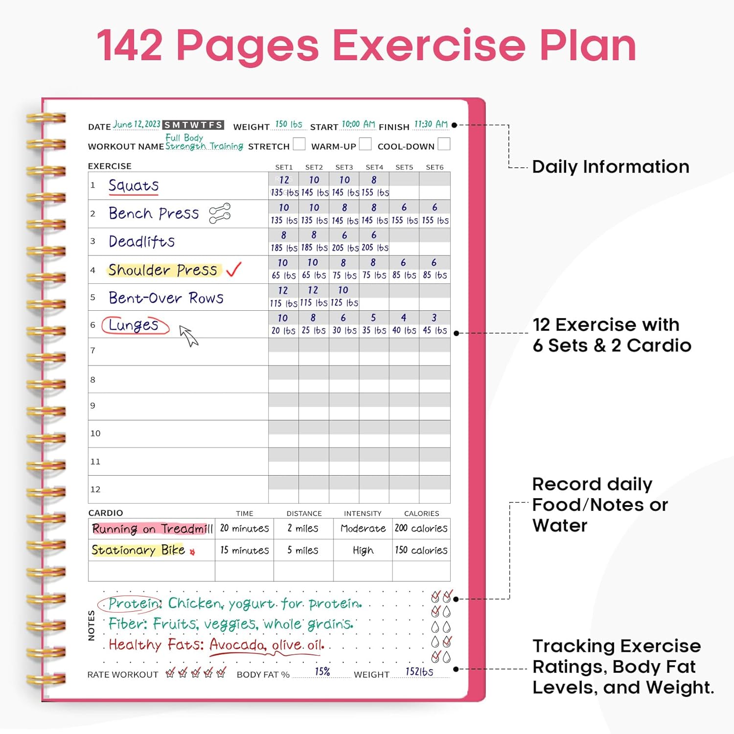 Track Your Workouts – Stay organized and record your gym workouts with this comprehensive fitness planner. It provides dedicated sections to log exercises, sets, reps, and weights, allowing you to monitor your progress over time.