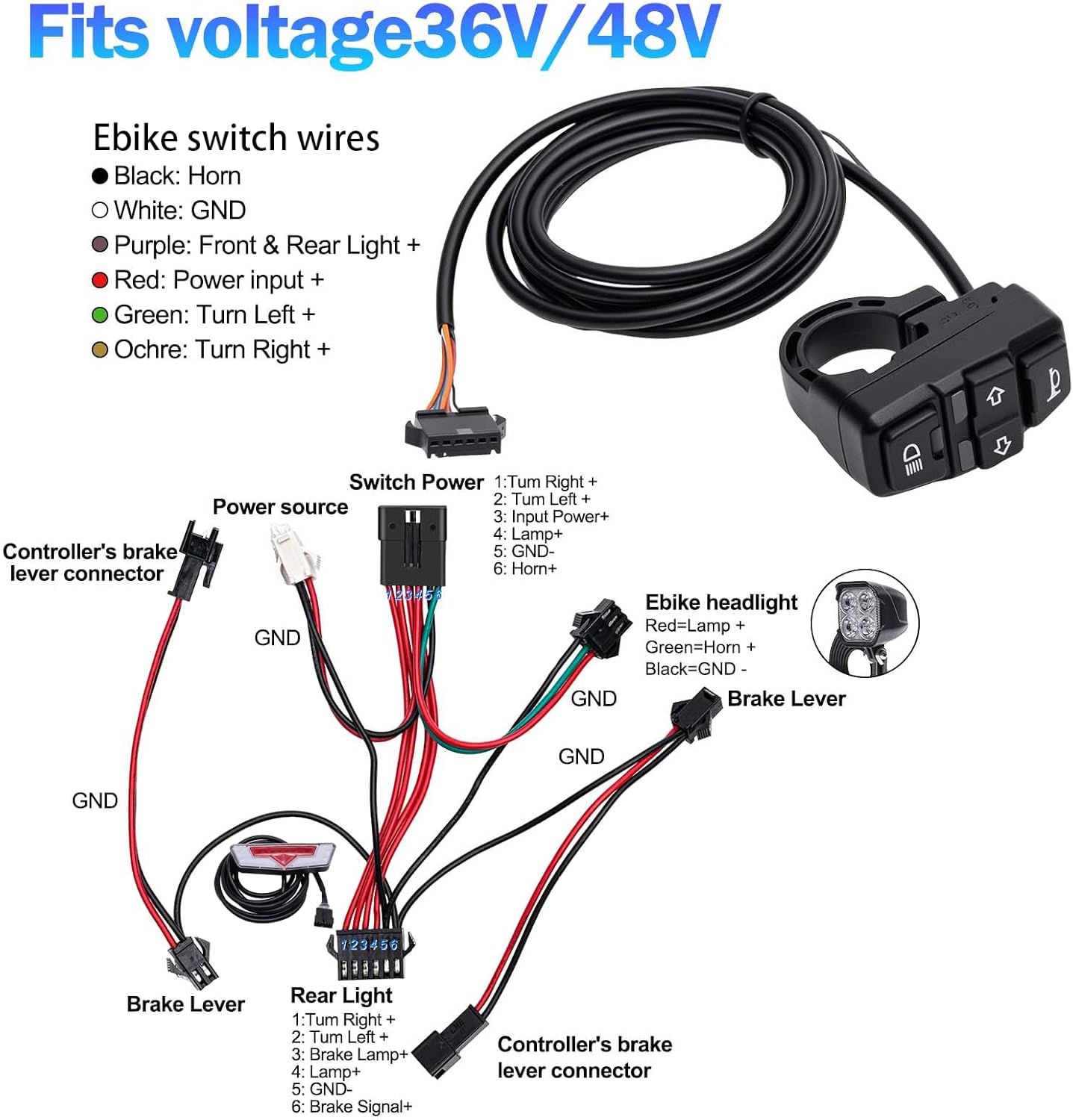 Compatible with 36V/48V systems, this kit includes a handlebar-mounted switch for easy control of all lighting functions.