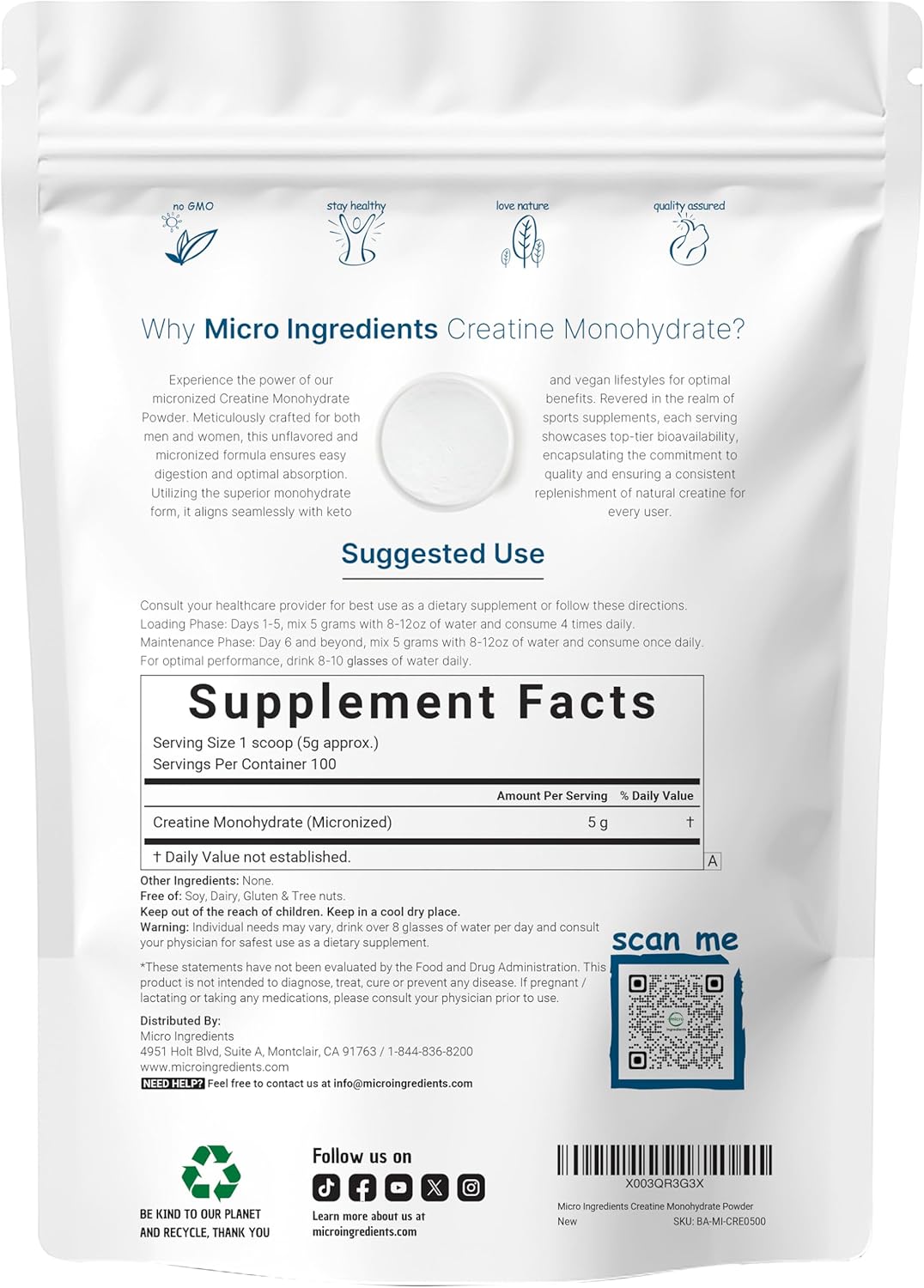 Micro Ingredients pure micronized creatine monohydrate powder. A natural workout supplement for men and women that is unflavored and designed to easily dissolve into any beverage or pre workout & post workout powder drinks. Each bag contains over a 3 months supply and offers 5g of pure creatine per scoop.