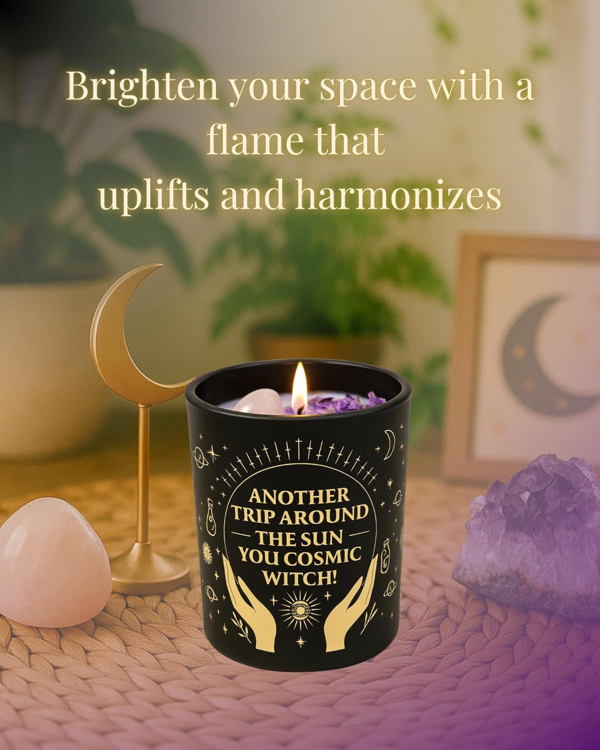 ✨ The Mystical Harmony Crystal & Flower Soy Wax Candle: Transform Your Home into a Sanctuary ✨ Welcome to a world of unparalleled elegance and tranquility with the Mystical Harmony Handmade Candle. This isn’t just a simple candle; it is a meticulously crafted piece of boho home décor and a thoughtful ritual tool designed to elevate your everyday living. Indulge in the luxury of clean, conscious burning with our premium 100% natural soy wax, a commitment to your health and the environment that guarantees a non-toxic, soot-free experience. Every unique candle is a dazzling masterpiece, a true work of art hand-poured with love and intention. Adorning the surface is a beautiful curation of genuine natural crystals, carefully selected to enhance your well-being and bring positive energy into your space. These sparkling gemstones are nestled among delicate, real dried flowers and a whisper of subtle glitter, ensuring an elegant and mystical presence that catches the light and the eye. It is the perfect accent for your nightstand, coffee table, bathroom, or meditation altar. Experience the power of long-lasting fragrance. Each generously sized candle contains 7oz of high-quality soy wax, expertly blended to deliver a strong, yet never overwhelming, scent throw for the entire 50 hours of clean burn time. Discover Your Signature Scent: We offer two exclusive, perfectly balanced aromas to suit your every mood: Peony with Amber: A captivating, sweet-scented candle offering a rich, floral aroma with a warm, romantic base. Ideal for creating a cozy, inviting atmosphere for date nights or self-care. Sage with Sea Salt: A refreshing, energizing scent that promotes clarity and a feeling of cleansing. This is your go-to aromatherapy candle for deep meditation, yoga, or revitalizing your space with positive energy. Searching for the perfect present? Look no further. This natural crystal soy candle serves as an unforgettable gift for women who appreciate handmade luxury and mindful living. Its artisanal quality and stunning presentation make it an original and thoughtful gift for a variety of occasions, whether you need a memorable Birthday Gift for woman, a romantic Anniversary Gift for her, a chic Housewarming Gift, or a spiritual treat for a friend. The recipient will be charmed by the unique, handcrafted details that ensure no two pieces are exactly alike. Bring harmony, beauty, and premium fragrance into your life. Simply light the wick, let the warmth melt the wax and release the exquisite aroma, and transform your space into a peaceful sanctuary. Buy your Mystical Harmony Candle today and experience the difference of a truly handmade, crystal-infused, and long-lasting luxury soy wax candle!