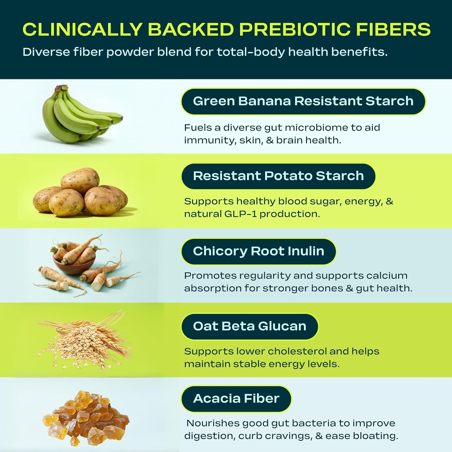 Premium Fiber Formula – High fiber powder with acacia fiber, resistant potato starch, chicory root inulin, green banana resistant starch & oat beta glucan; natural prebiotic fiber supplement without fillers.