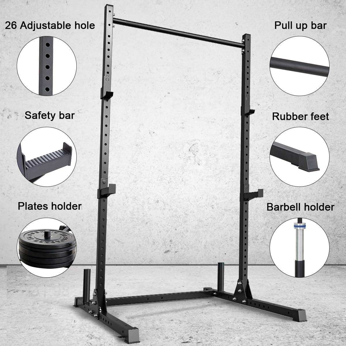 Squat Rack with Pull Up Bar for Home Gym, Adjustable Power Cage with J-Hooks, Multi-Functional Power Rack for 6FT, 7FT Barbell, Strength Training and Bodybuilding Equipment